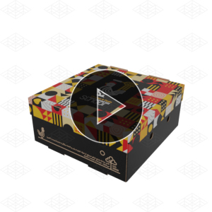 متریال درب و زیره در این جعبه سوخاری با هم متفاوت است. جنس زیره از مقوای ای فلوت و جنس درب از مقوای ایندربرد است. به همین دلیل از دو تکنیک چاپ متفاوت برای تولید جعبه استفاده میشود. درب جعبه با تکنیک چاپ افست و زیره آن با تکنیک چاپ فلکسو تولید میشود.